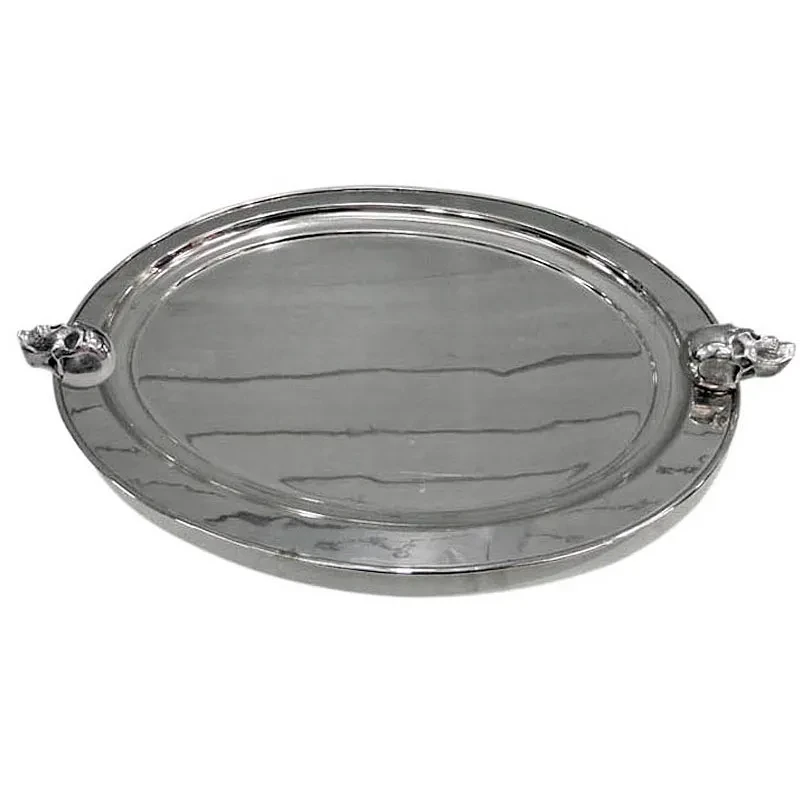 Ze zijn gemaakt van duurzaam metaal en zijn voorzien van schedelhandvatten, wat een stoere en stijlvolle afwerking geeft. Of je nou een liefhebber bent van schedels of gewoon op zoek bent naar decoratieve accessoires, deze dienbladen zijn een must-have. Met de mogelijkheid van snelle levering hoef je niet lang te wachten om van je aankoop te genieten. En dat alles voor de beste prijs! Met de eigenschappen geen etsen, zilveren kleur, ronde vorm, metaal materiaal, schedelstijl en schedelhandvatten behoren deze dienbladen echt tot de decoratieve categorie.