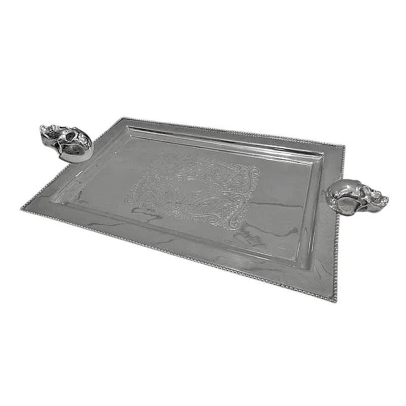 Het is versierd met etsen met schedels, wat een coole en trendy uitstraling geeft. De handvatten hebben zelfs de vorm van schedels, waardoor het gemakkelijk is om het dienblad vast te houden en te dragen.